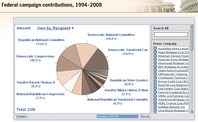 Interactive summary of $370 million in US campaign contributions made by originators of sub-prime mortgages, 1994-2008. Related article.