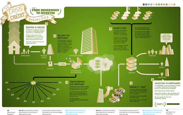 I recently came across FlowingData, a fantastic blog of data analysis and graphic design. Nathan covers a lot of the same territory that I do here, but casts a much broader net and has a lot of discussion about the design methods and tools of the trade. This post about Financial Crisis visualizations is a great example. The links below are to graphics I haven’t posted before (most of which are from a Good Magazine contest).