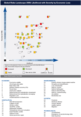 The World Economic Forum’s Global Risks Report 2009 contains some interesting risk charts. Full report. Graphics brief. Press release.