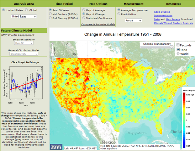 Take a look at temperature changes over the past 50 years, then select from several different models to simulate changes for the next 100. Produced by the Nature Conservancy, University of Washington, and University of Southern Mississippi, the amount of detail and explanation is welcome versus some of the more popular projection maps out there. (via)