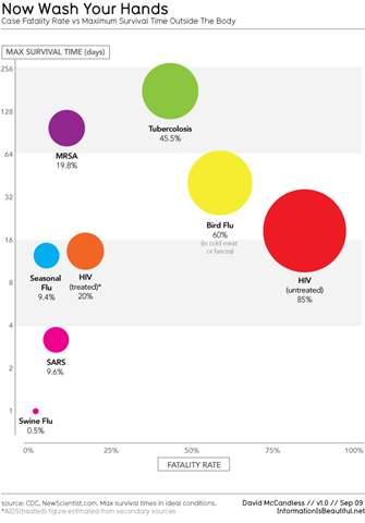 Fatality rates for a number of diseases, and fatality rate vs survival time outside the body (why you should wash your hands). Designed and researched beautifully by Information is Beautiful.