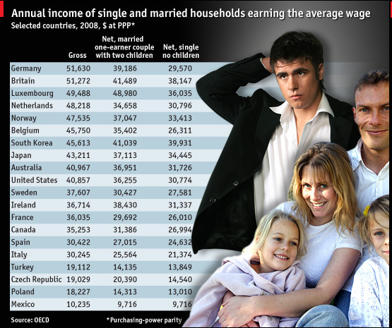 In all but one of 30 OECD countries, a married one-earner couple with two children takes home more money than a single person with no children on the same average annual salary. (from Economist)